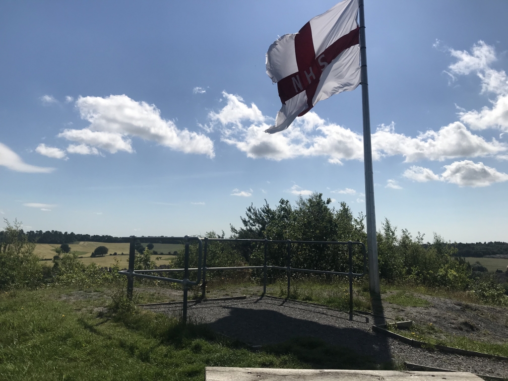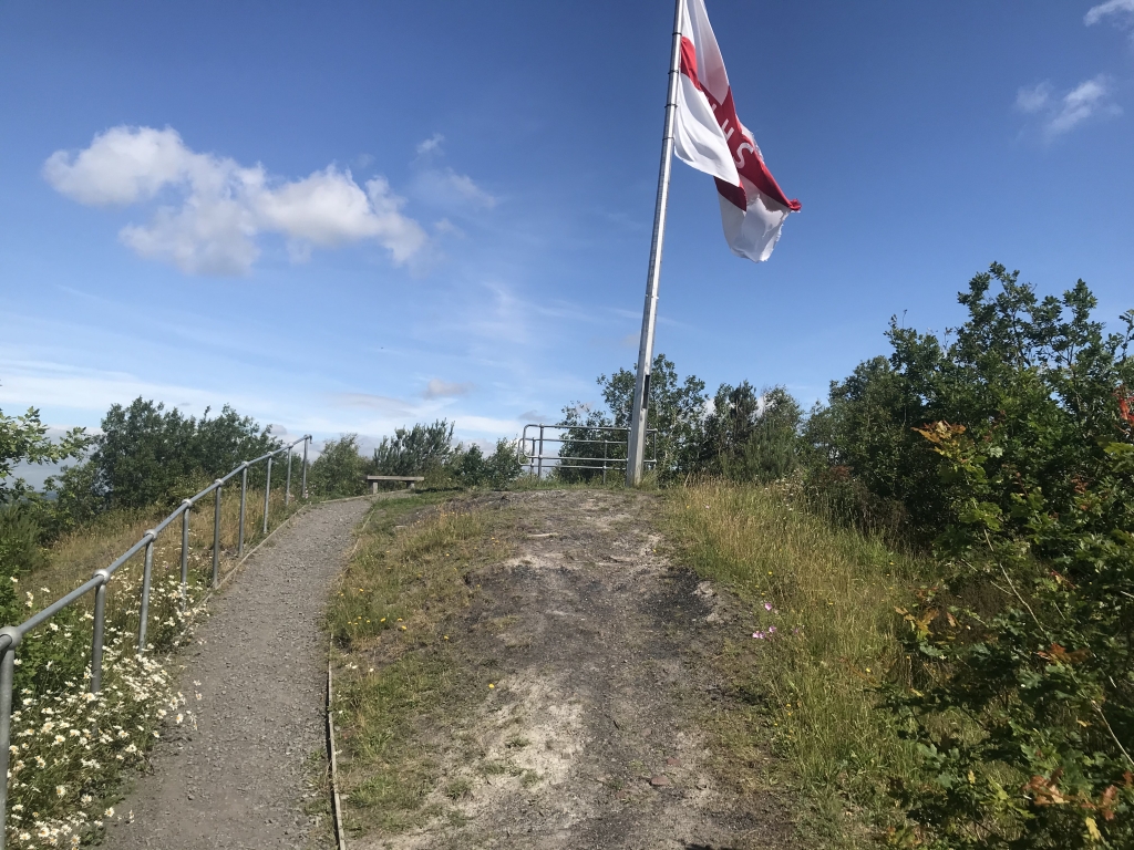Eventually take the left path passing between the steel railings. From here the path becomes steeper as it heads towards the Flag at the top.