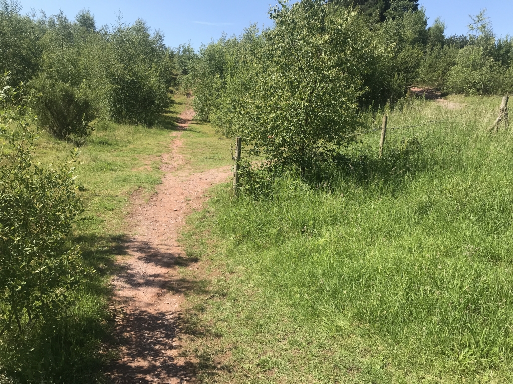 Gradient steepens here, immediately after the fence post follow the path right, up hill.