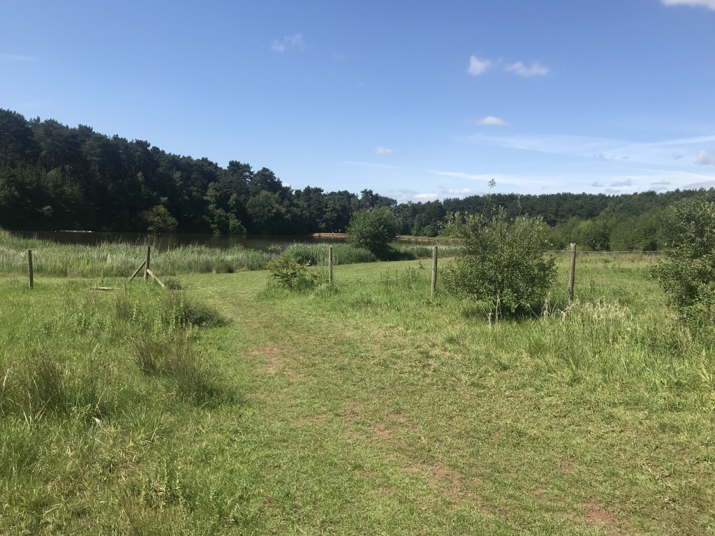 Pass between 2 fence posts, heading towards the Lake. Keeping the Lake to your left, walk around the Lakeside path can be boggy.